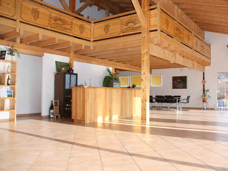 Intérieur spacieux et vue sur les Alpes valaisannes, idéal pour les groupes jusqu'à 80 personnes.