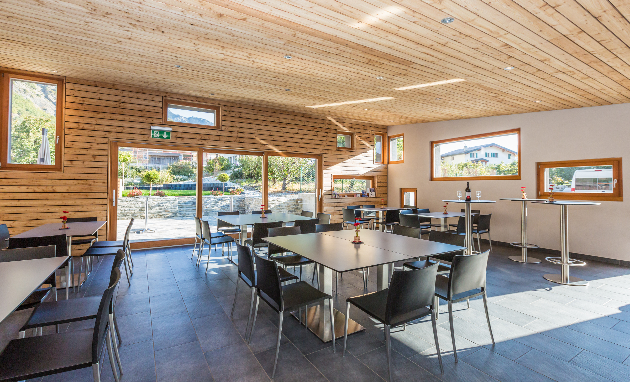 Bois de mélèze et pierres naturelles se marient dans cet espace d'une capacité de 50 personnes. En savoir plus